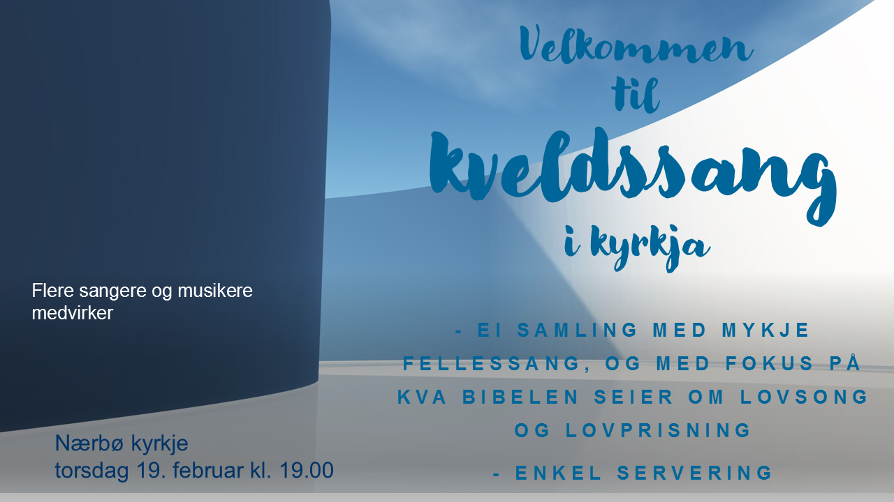 Velkommen til kyrkja torsdag 19. februar kl. 19.00. Me skal få høyre kva bibelen seier om lovsang og nyte ein stemningsfull kveld i lag full av allsang. Det blir enkel bevertning etter sangen. Arrangementet er gratis.